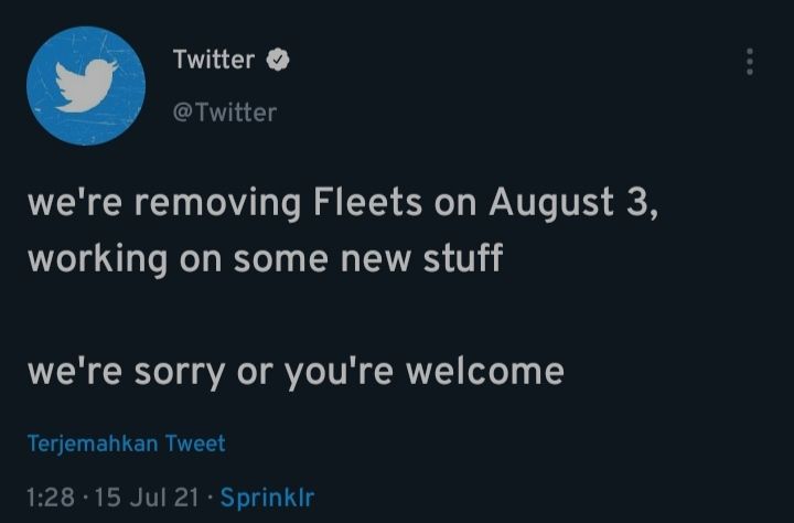 Di bulan Juli 2021 Twitter secara resmi akan mulai menghapus Fleets pada 3 Agustus 2021. Twitter sebelumnya telah mengumumkan rencananya untuk tweet singkat Fleet ini dan telah menguji fitur tersebut di Brasil Italia India dan Korea Selatan. Fitur Twitter yang mirip Instagram Stories ini resmi ditutup mulai hari ini Rabu 482021.